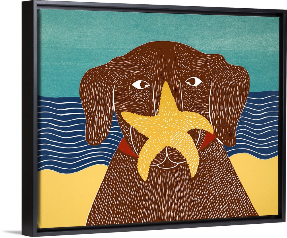 <p>Illustration of a chocolate lab at the beach with a starfish on its nose.</p>