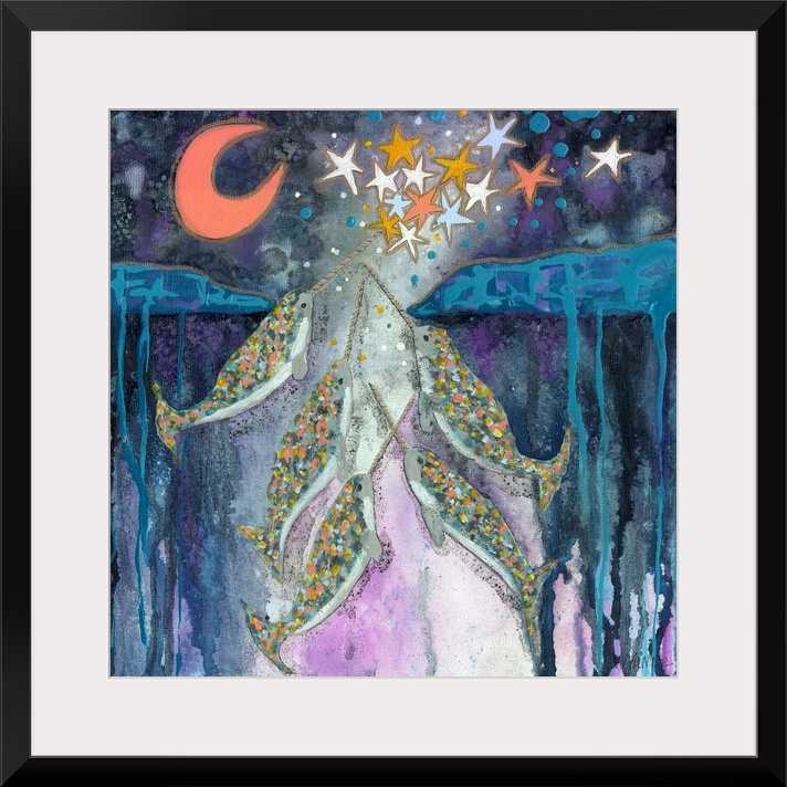 <p>A group of narwhals in the ocean creating stars for the night sky.</p>