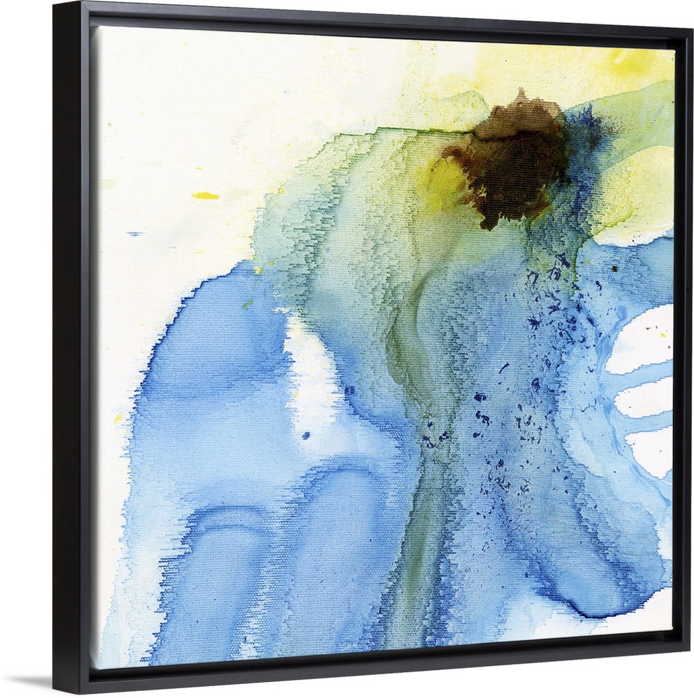 <p>A contemporary abstract watercolor painting using a light blue wash with a splash of bright yellow against a white background.</p>
