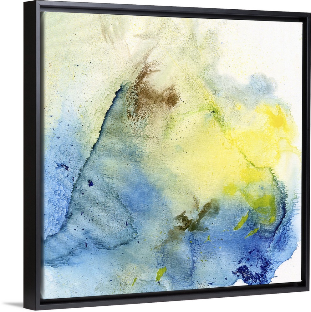 <p>A contemporary abstract watercolor painting using a light blue wash with a splash of bright yellow against a white background.</p>
