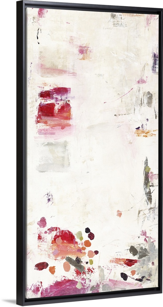 <p>A long vertical abstract with brush strokes of shades of red and gray.</p>