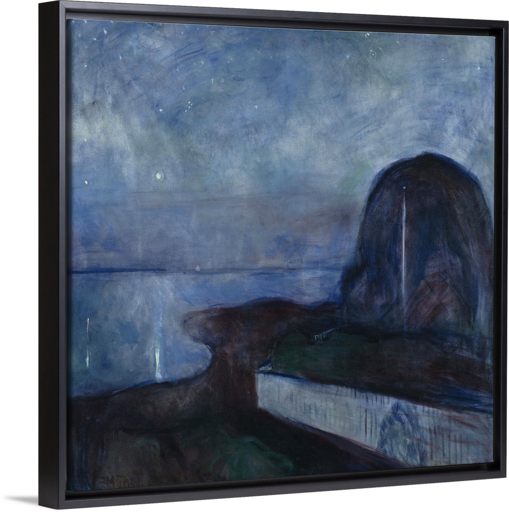 <p>Starry Night, by Edvard Munch, 1893, Norwegian painting, oil on canvas. Night landscape at Asgardstrand, a small beach resort south of Oslo in Norway, where Edvard Munch spent his summers from the 1880s onward. In this expressionist painting Munch capture</p>