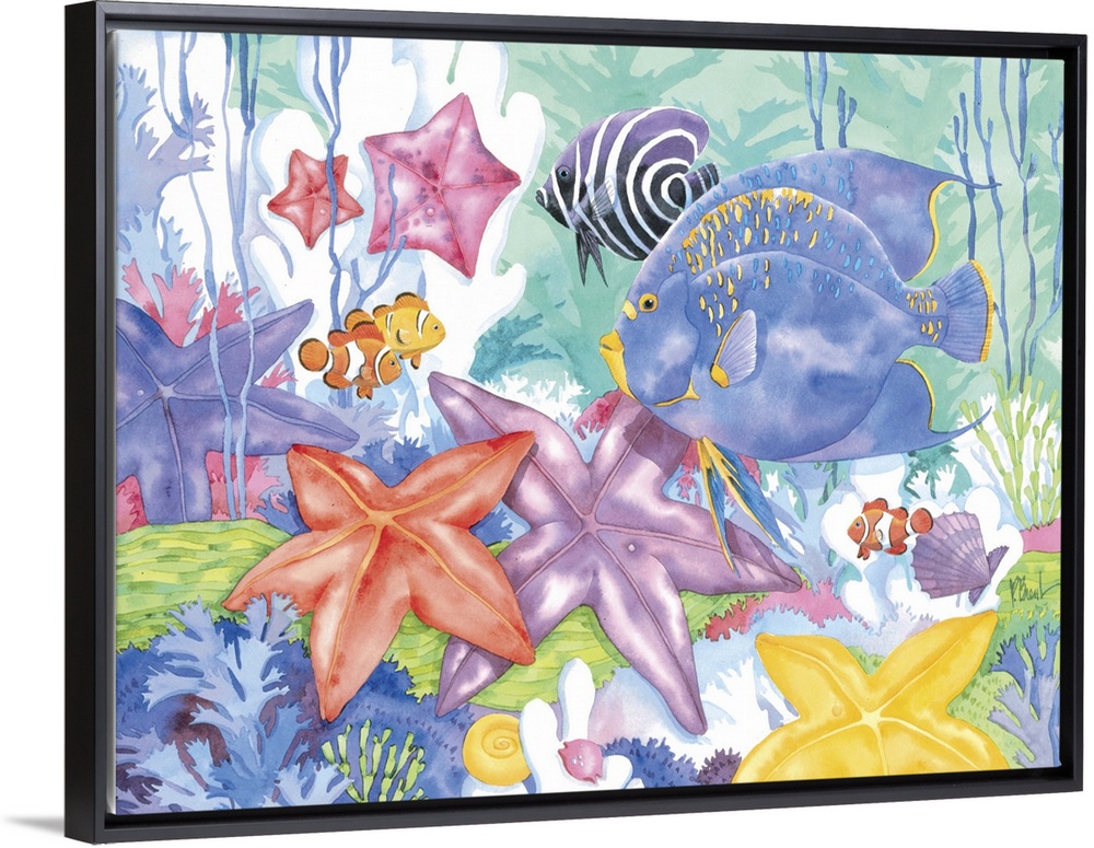 <p>Contemporary painting of an underwater scene with starfish and tropical fish.</p>