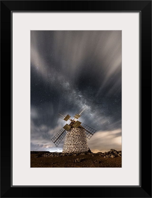<p>Starry sky above the stone windmill, La Oliva, Fuerteventura, Canary Islands, Spain.</p>