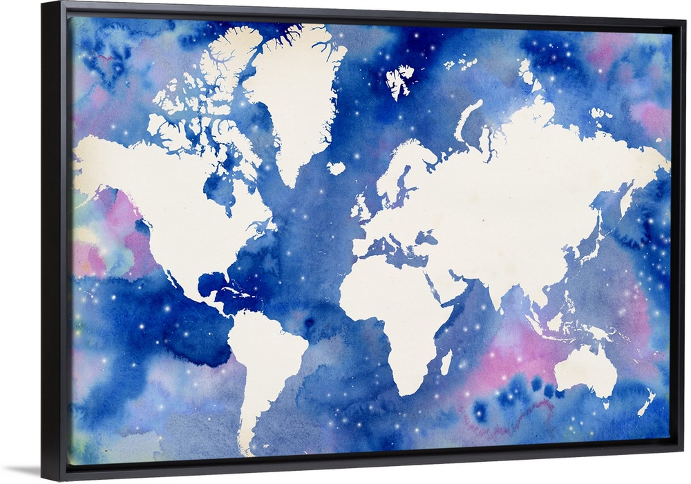 <p>The sea in this world map resembles a starry night sky and is filled with watercolor droplets in blue and pink with white dots throughout.</p>
