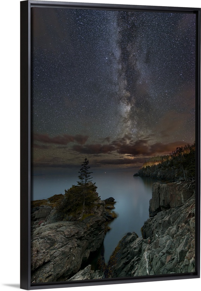 <p>Long exposure photograph of the starry night sky over the Quoddy Channel at Quoddy Head State Park, Maine.</p>