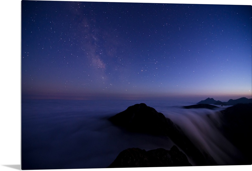 <p>Skyscape in the evening with stars, above a misty mountain range.</p>