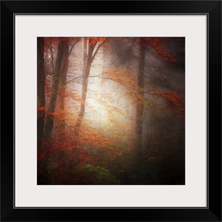 <p>Sunlight shining in a misty autumn forest creating an eerie glow.</p>