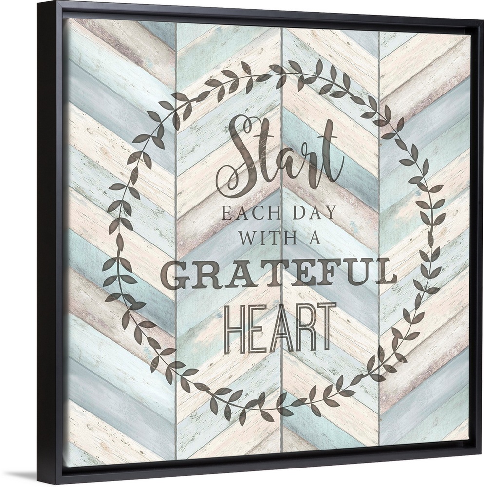 <p>"Start Each Day With A Grateful Heart" surround by a wreath on a chevron wood background.</p>