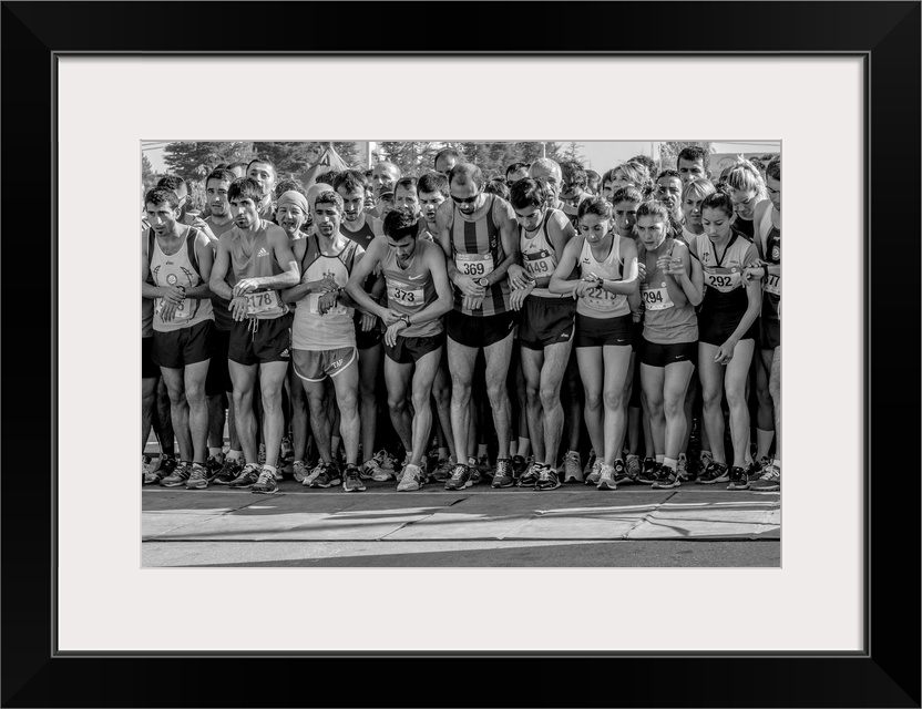 <p>A portrait of a large group of people lined up and ready to race.</p>