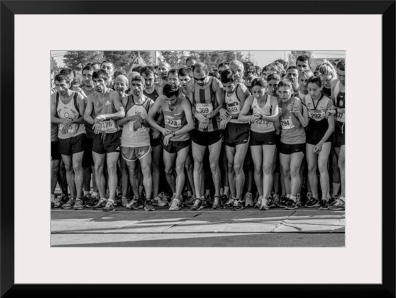 <p>A portrait of a large group of people lined up and ready to race.</p>