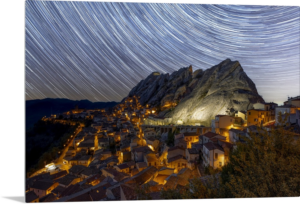 <p>Startrails, captured during a summer night in Pietrapertosa, municipality of Pietrapertosa,Potenza province, Basilicata district, Italy, Europe. Basilicata, Western Europe, Italy.</p>