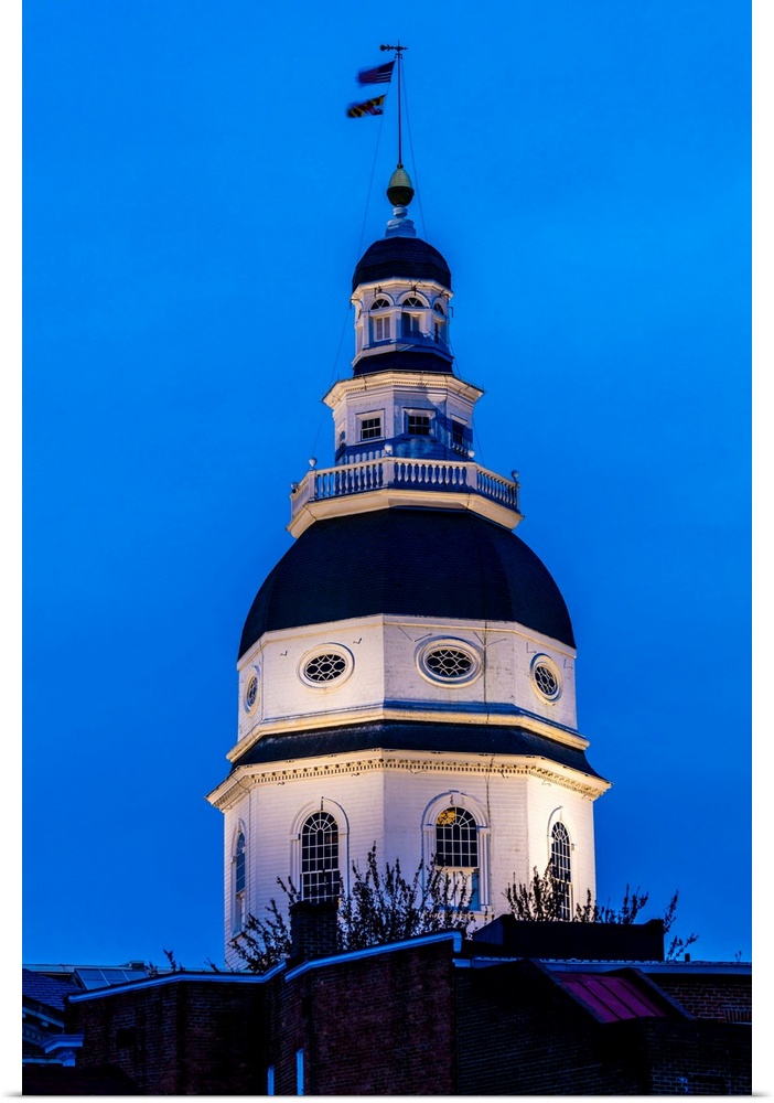 <p>State capitol is seen at dusk above main street, annapolis, maryland.</p>