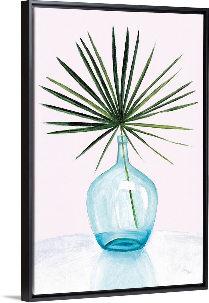 <p>Vertical contemporary painting of a palm leaf in a glass vase.</p>
