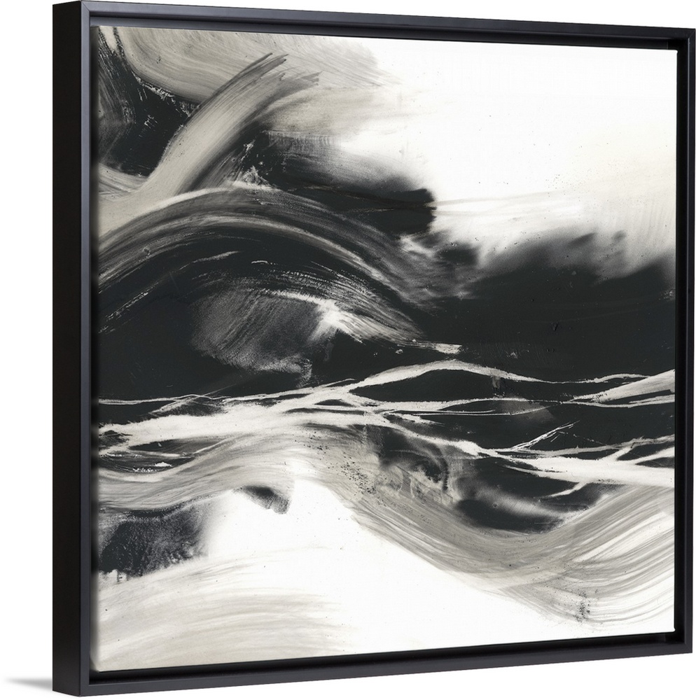 <p>Sweeping horizontal black brush strokes fills this contemporary painting with stirring energy.</p>