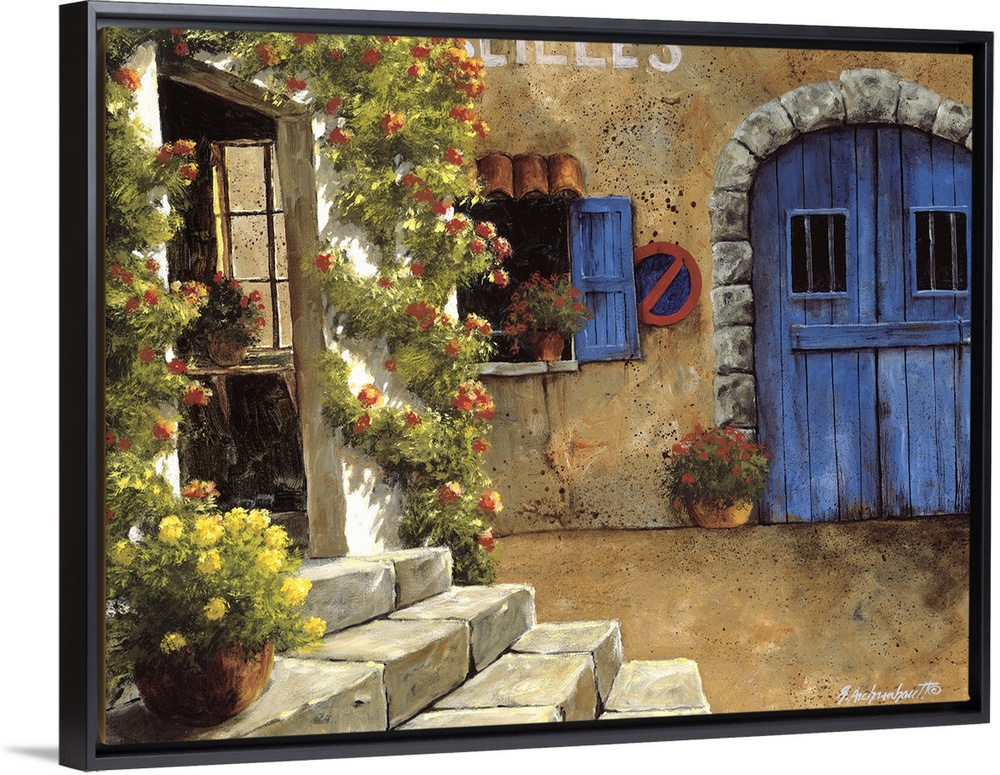 <p>Painting of a No Parking sign next to a blue door in a European village.</p>