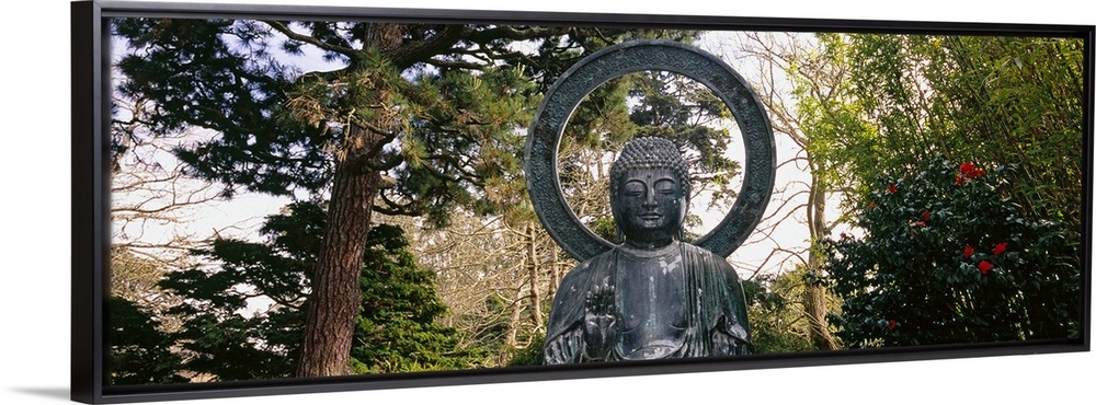 <p>This Buddha statue is pictured as a panorama with trees scattered about in the background.</p>