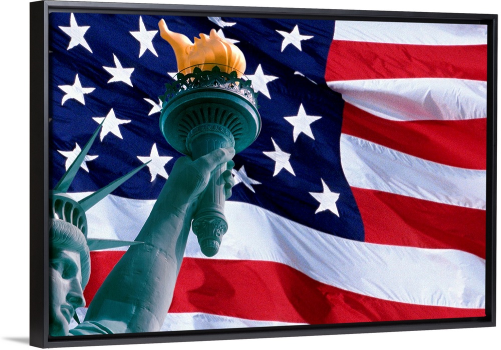 <p>Large, landscape photograph of the American Flag, the face of the Statue of Liberty in the bottom corner, holding the torch.</p>