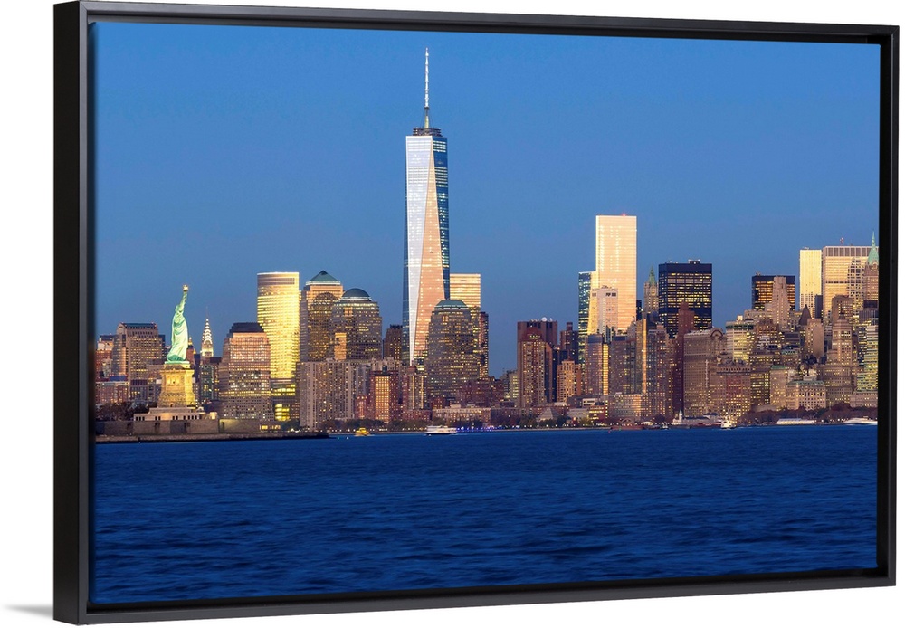 <p>Statue of Liberty, One World Trade Center and Downtown Manhattan across the Hudson River, New York, Manhattan, United States of America.</p>