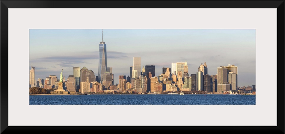 <p>Statue of Liberty, One World Trade Center and Downtown Manhattan across the Hudson River, New York, Manhattan, United States of America.</p>