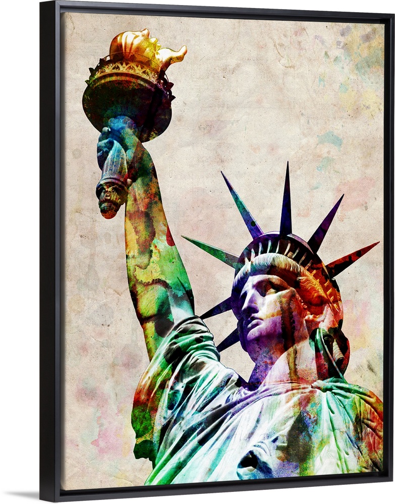 <p>The statue of liberty is filled in with various water colors showing her from the chest up.</p>