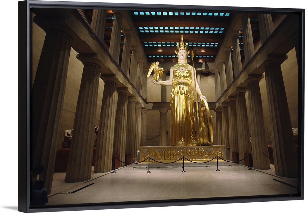 <p>A golden statue of Athena stands in an art museum that is a replica of the original Parthenon in Greece.</p>