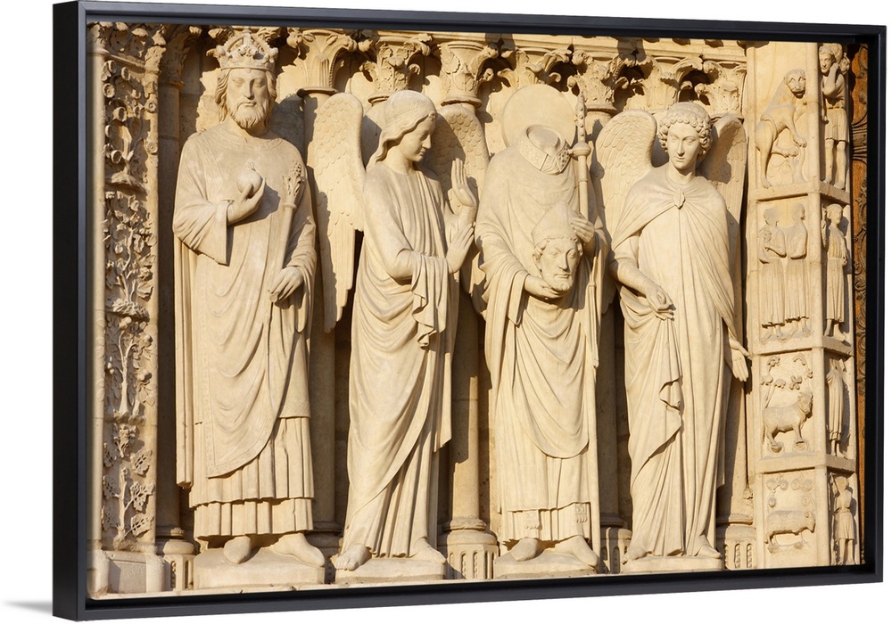 <p>Statues including the Emperor Constantine and St. Denis carrying his head, Virgin's Gate, west front, Notre Dame Cathedral, UNESCO World Heritage Site, Paris, France, Europe.</p>