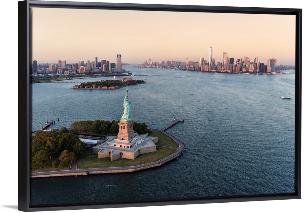 <p>Stature of Liberty and Manhattan from above at sunset</p>