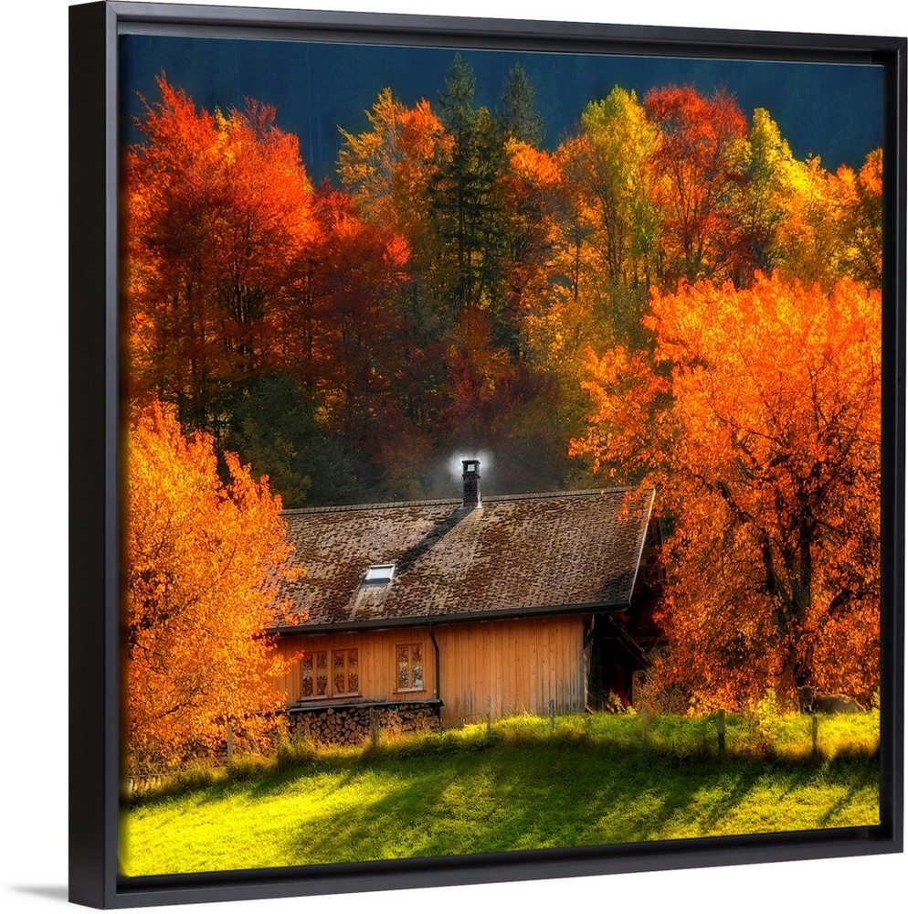 <p>Big artwork of a cabin with a smoking chimney in the woods in autumn as the leaves turn to their fall colors.</p>