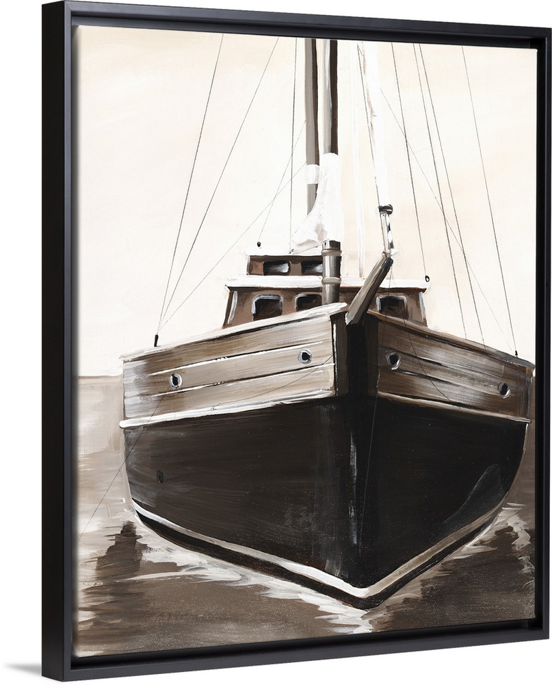 <p>Sepia toned painting of the front of a sailboat.</p>