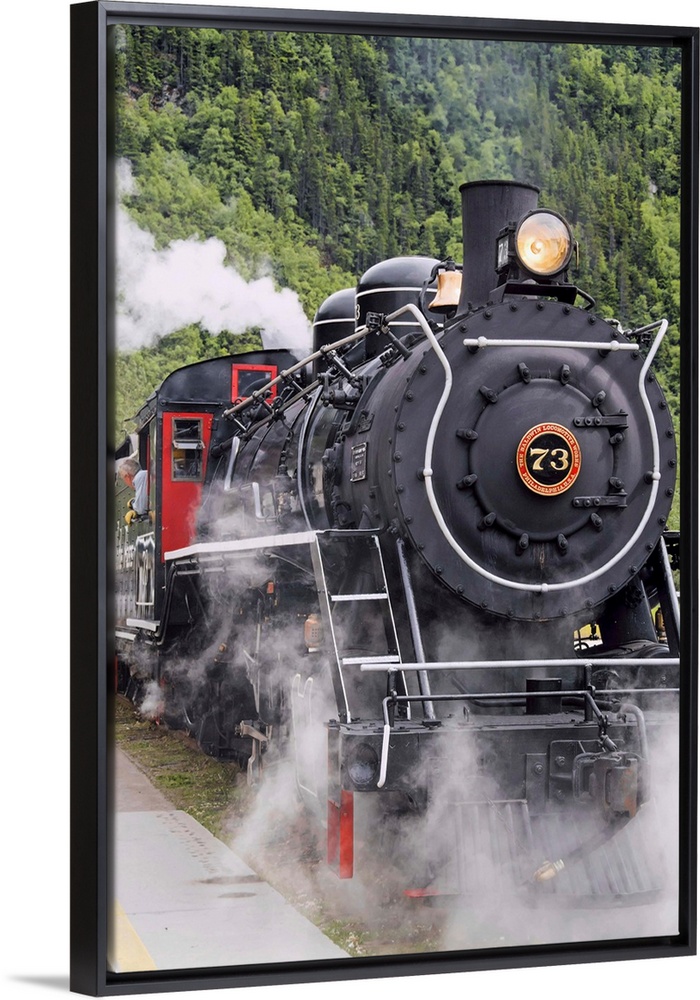 <p>Steam locomotive 73 at downtown depot of White Pass and Yukon Route RR in Skagway, Alaska. Narrow gauge, built by Baldwin Locomotive in 1947.</p>