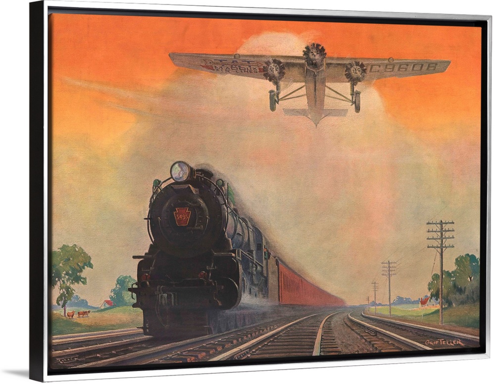 <p>Steam powered locomotive and Ford Tri-Motor airplane speeding through in rural landscape. Poster for Pennsylvania Railroad with painting by Grif Teller. 1931.</p>