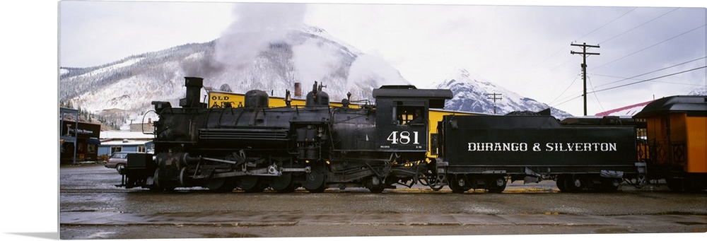 <p>Oversized, horizontal photograph of a steam powered train and cars at the Durango and Silverton Narrow Gauge Railroad in Colorado, snow covered mountains in the background.</p>