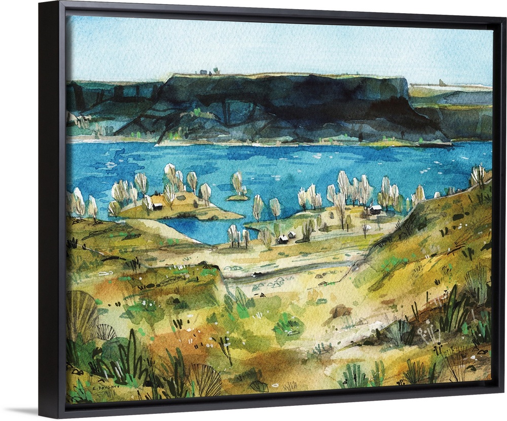 <p>A short but steep hike up Steamboat Rock gives stunning vantages of the Columbia River Gorge below. The water really is that blue! This sunny winter scene was rendered in watercolor.</p>