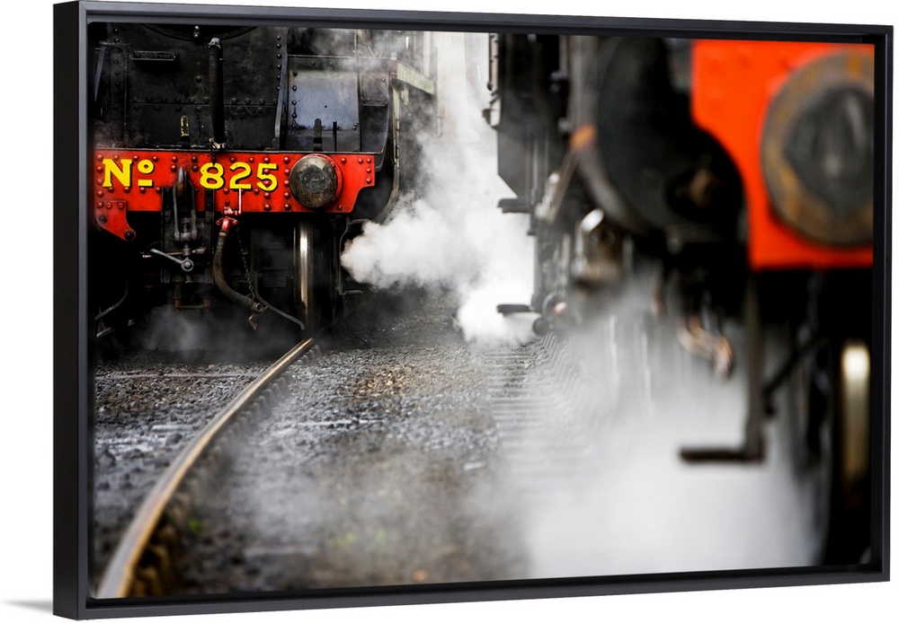 <p>This wall art piece depicts the front of two trains, one up close and one further back, both with steam billowing out.</p>