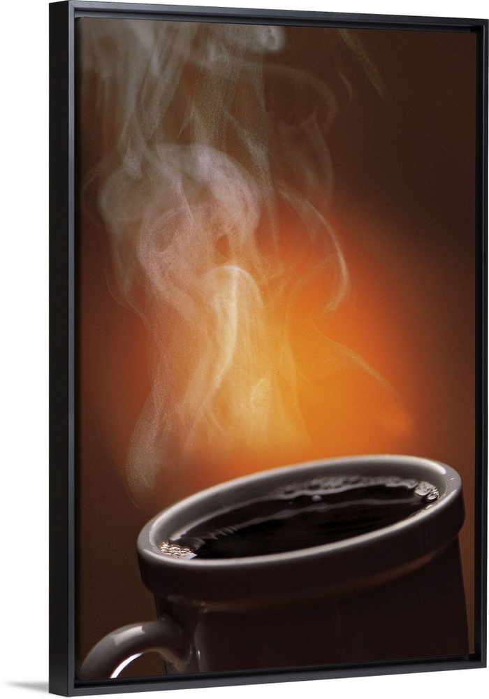 <p>This large vertical piece is a picture taken of a cup of black coffee with steam coming off of it.</p>