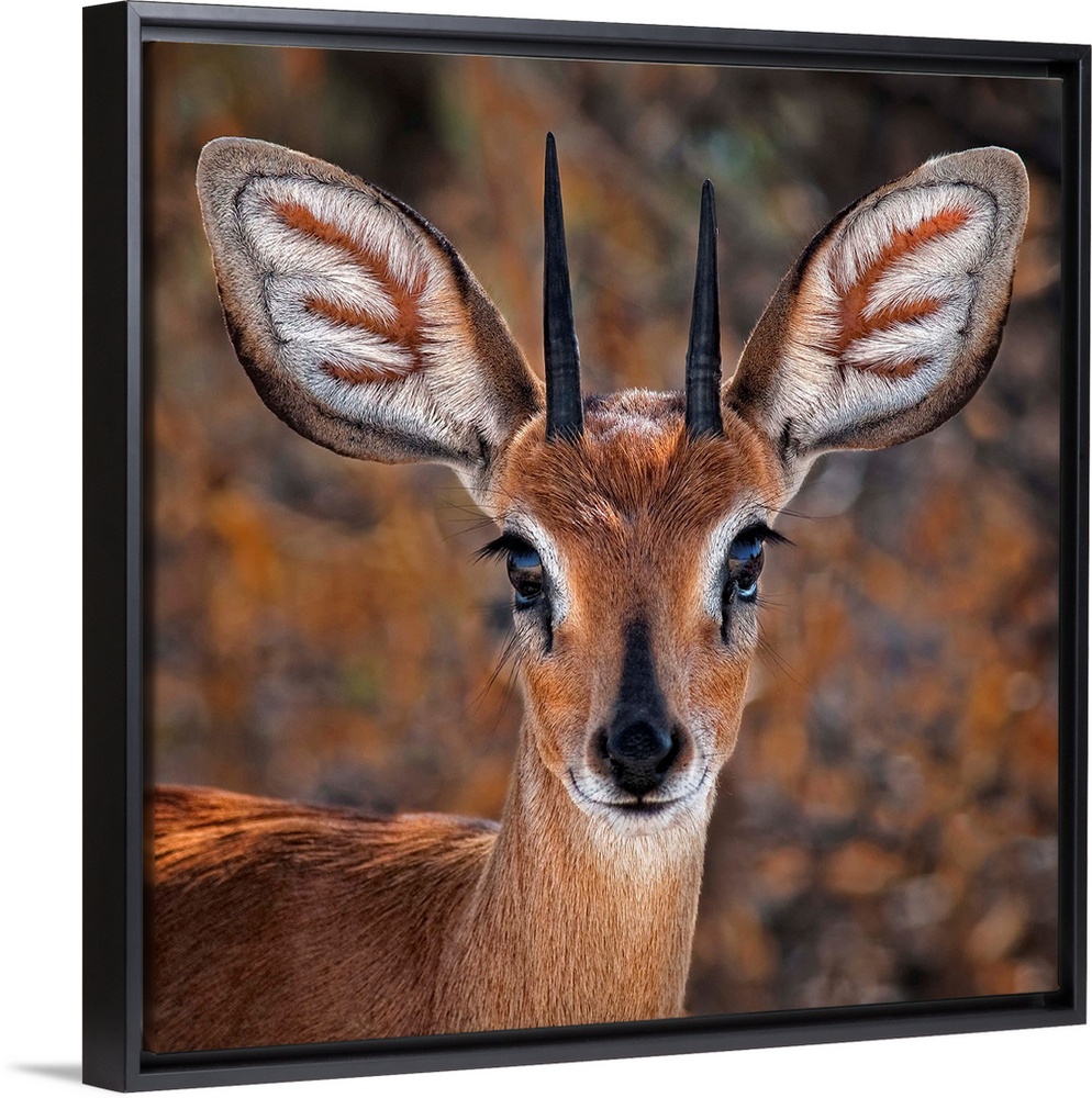 <p>Portrait of a steenbok, a small antelope with large ears and pointed antlers.</p>