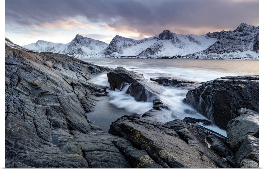<p>View towards Steinfjord and snow-covered mountains at sunset in winter, from Tungeneset, Senja Island, Norway.</p>