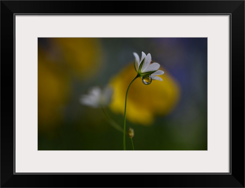 <p>Macro photograph of very tiny wild flowers in Norway with a large water drop underneath the petals.</p>