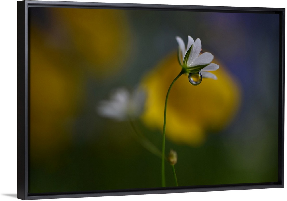<p>Macro photograph of very tiny wild flowers in Norway with a large water drop underneath the petals.</p>