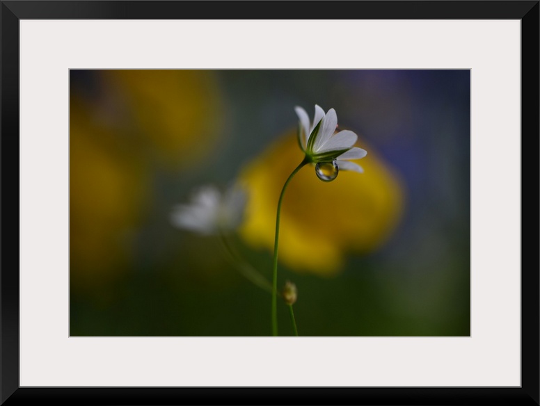 <p>Macro photograph of very tiny wild flowers in Norway with a large water drop underneath the petals.</p>