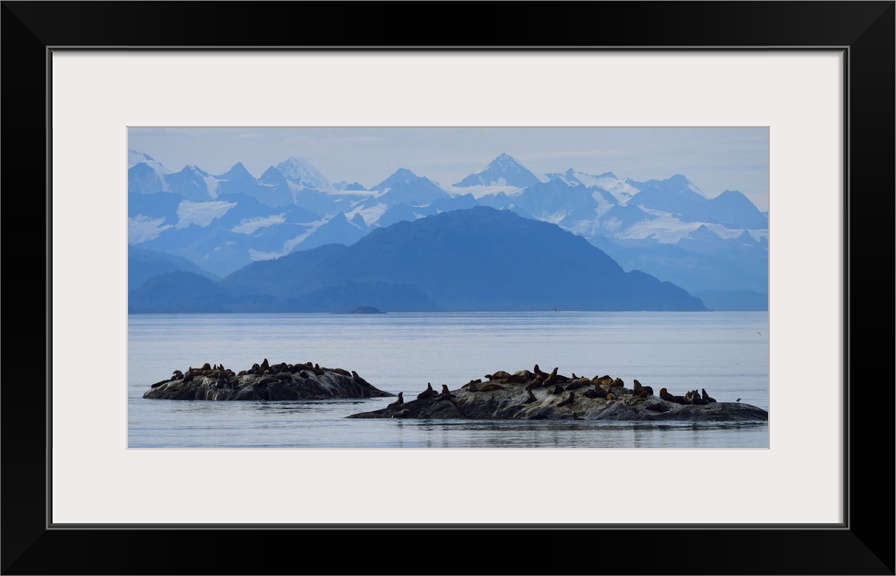 <p>Steller sea lions (Eumetopias jubatus) gathered on islets just off South Marble Island in Glacier Bay National Park and Preserve, Inside Passage, Alaska, USA, Alaska, United States of America</p>