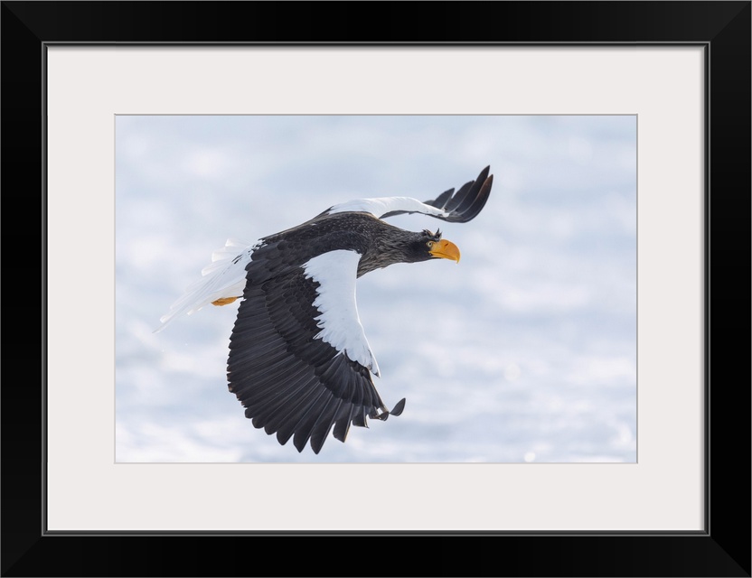 <p>Steller's sea eagle (Haliaeetus pelagicus) flying over sea ice in the Nemuro Strait, Hokkaido, Japan. Hokkaido, Japan.</p>