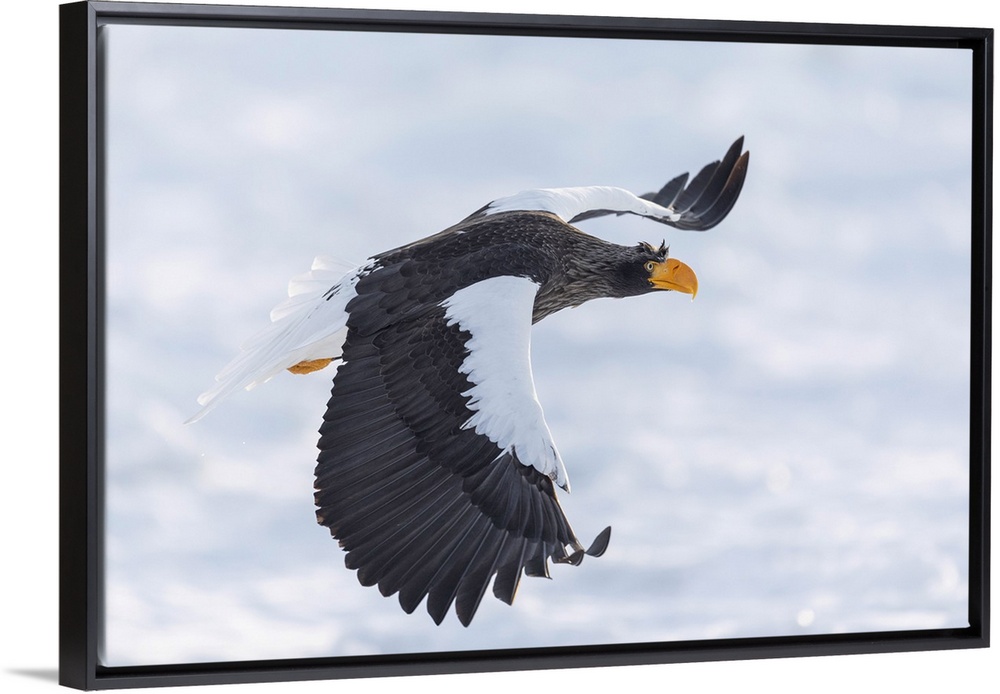 <p>Steller's sea eagle (Haliaeetus pelagicus) flying over sea ice in the Nemuro Strait, Hokkaido, Japan. Hokkaido, Japan.</p>