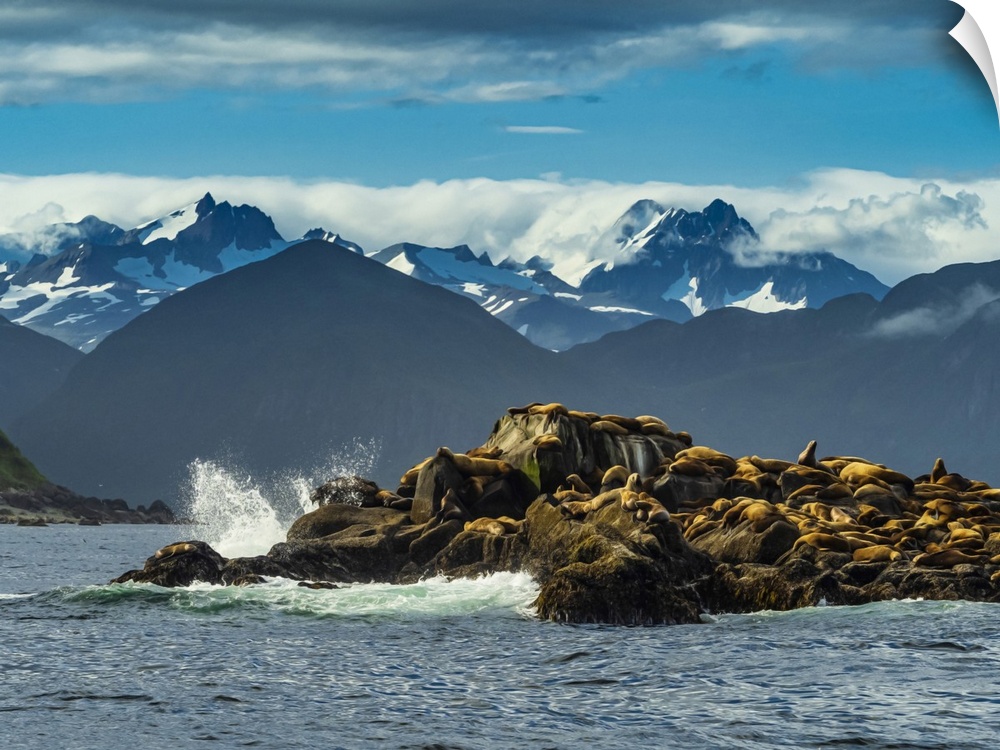 <p>Stellers Sea Lions (Eumetopias jubatus) hauled out on rocky island Katmai National Park, Alaska, United States of America</p>