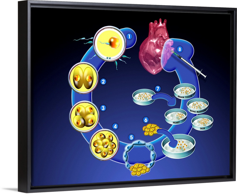 <p>Stem cell research. Computer artwork of the stages (anticlockwise from upper left) involved in stem cell therapy. 1: An egg cell is fertilised by a sperm cell. 2-4: The resulting embryo divides 3 times over the next 3 days. 5: By around day five, the blastocyst embryo has developed and consists of an inner cell mass of stem cells and an outer layer that will form the placenta. The stem cells would differentiate into the various tissues of a foetus. 6: Here, the stem cells are removed and cultured. 7: Different tissue types may be grown, including bone marrow and skin. 8: Heart muscle cells are injected into a heart to treat disease.</p>