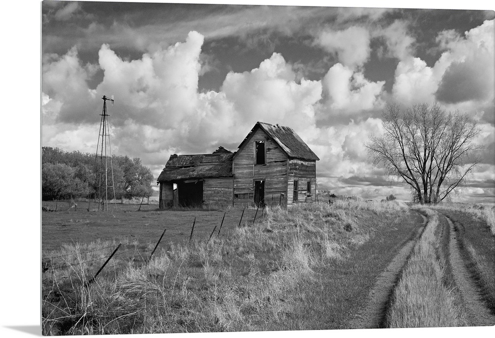 <p>rural scene with old barn and farm track under cloudy sky in Rolette County USA</p>