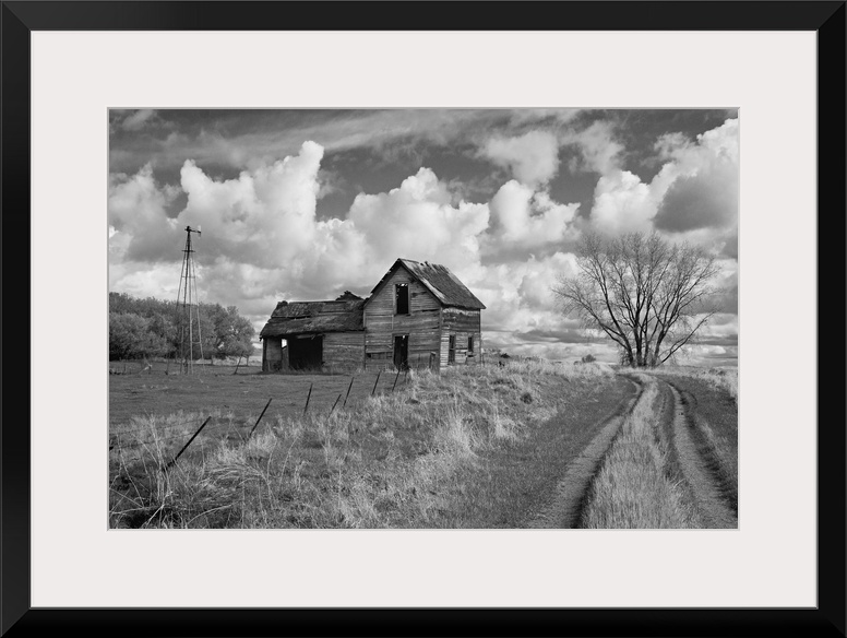<p>rural scene with old barn and farm track under cloudy sky in Rolette County USA</p>