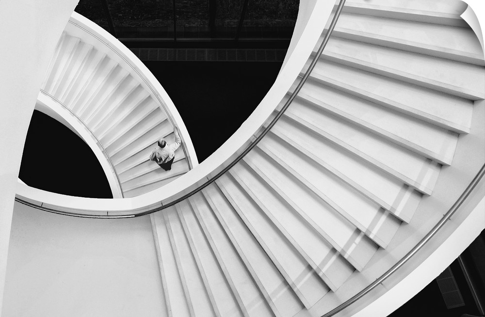 <p>Person walking up a spiraling staircase, seen from above.</p>