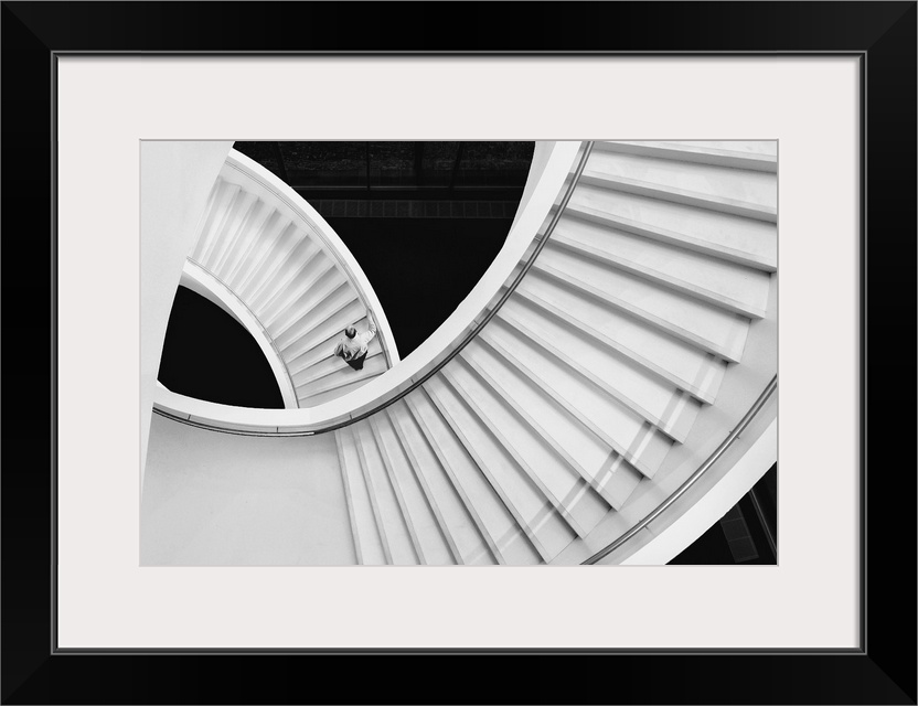 <p>Person walking up a spiraling staircase, seen from above.</p>